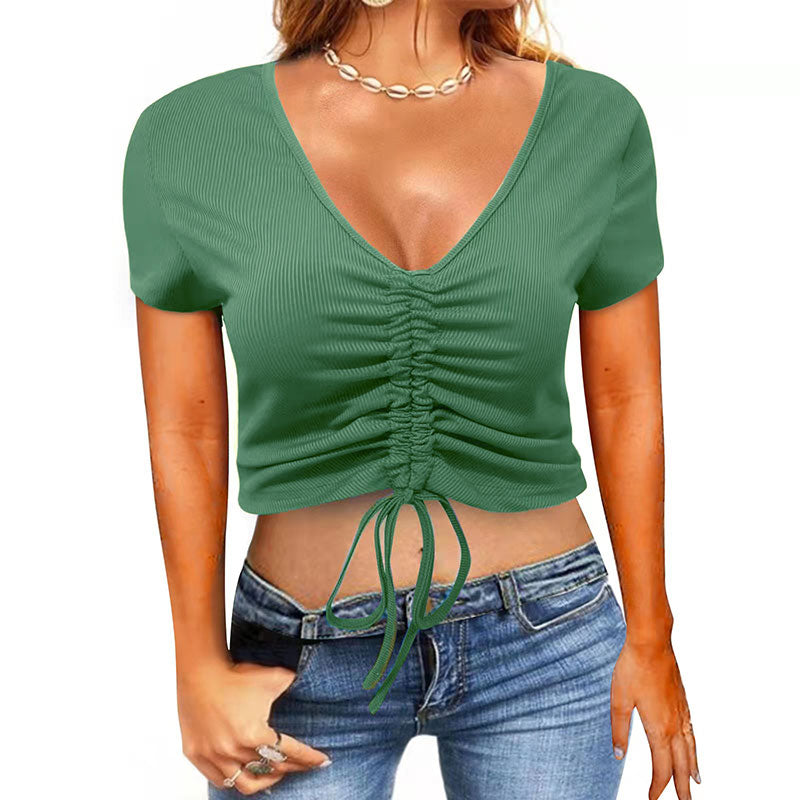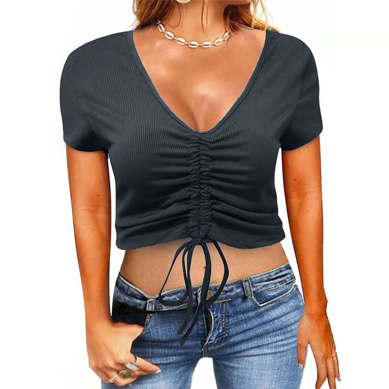 Fashionable Drawstring Crop Neck V Neck Sport Women’s T-Shirt