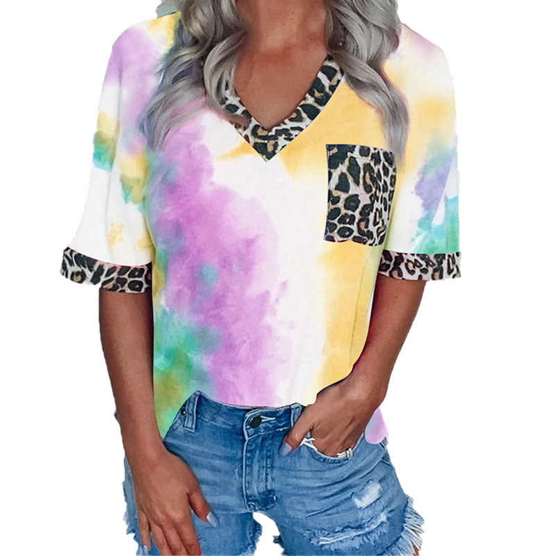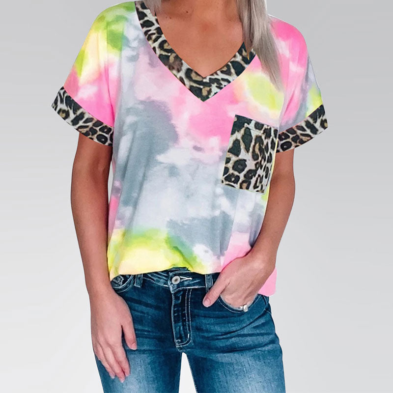 Fresh And Sweet Casual Tie Dye Leopard Pocket Women’s T-Shirt