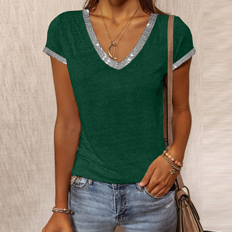 V Neck Shiny Contrast Color Casual Fashion Women’s T-Shirt