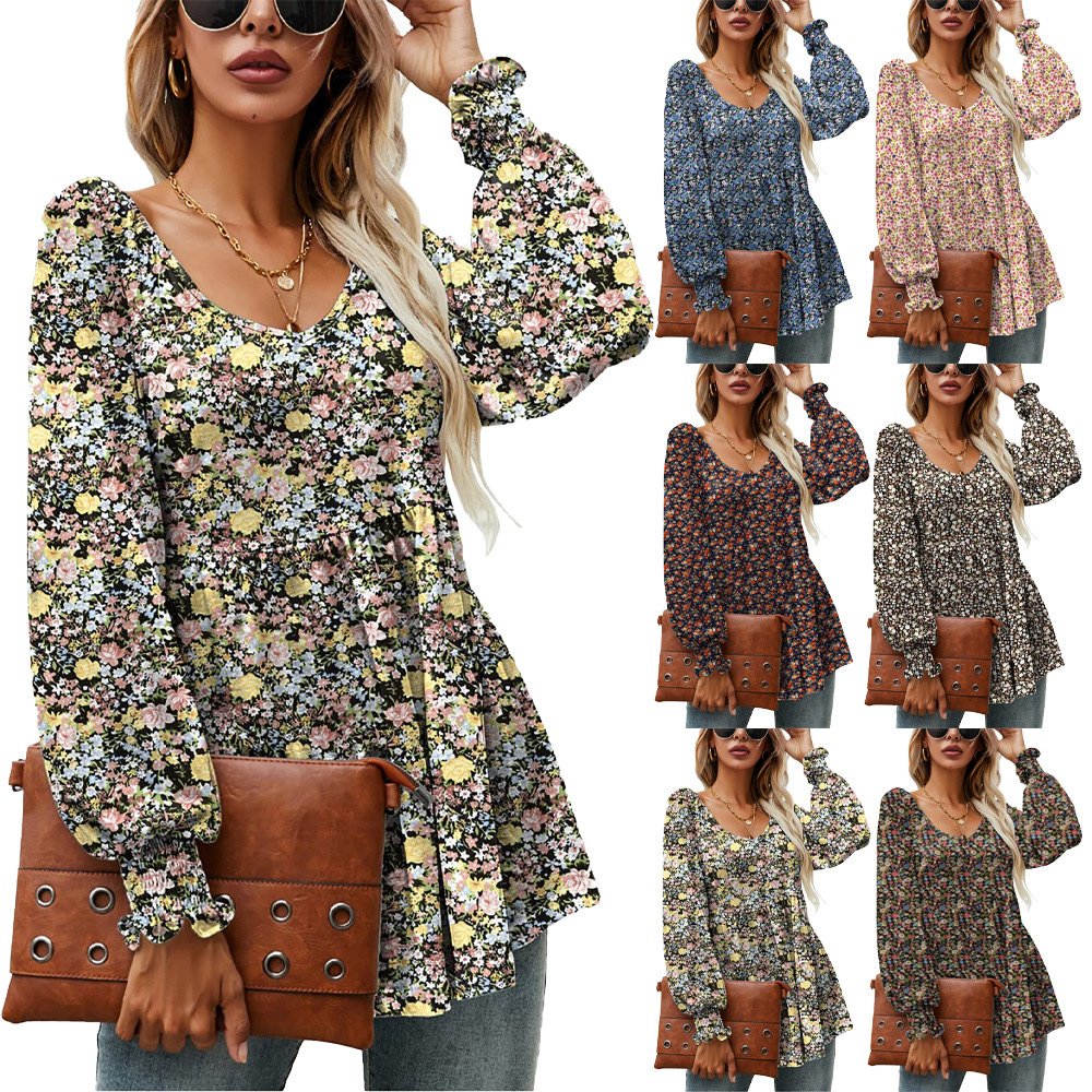 Women Swing Hem Long Sleeve Tops Bohemian Work Floral Print Pullover V Neck Tunic Blouse