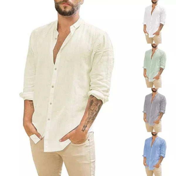 Men’s Summer Stand-up Collar Cotton Linen Casual Loose Shirt