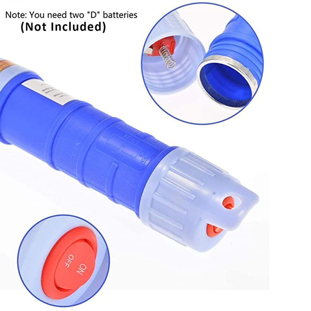 1. First. twist off the lid to open the battery cover. Insert 2 D batteries (not included) and twist back the cover. Next. insert the suction pipe into the supply (sending) container. Place the other end of the pipe to the receiving container to transfer liquid. Then press the button. Press the button again if you want to stop transferring liquid.