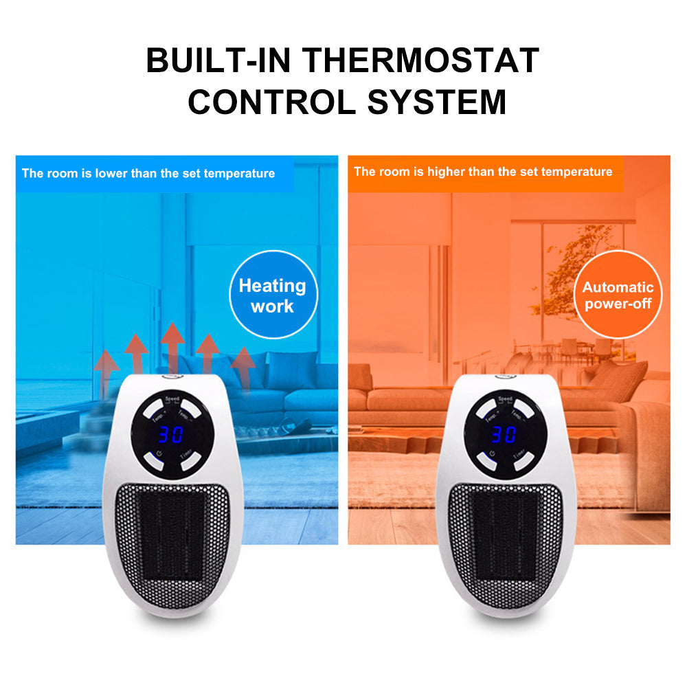 A wall outlet portable space heater for small spaces use. with compact structure and lightweight body. adopts a high-quality ceramic PTC heating plate. let you are surrounded by warmth quickly and get rid of the annoying cold.