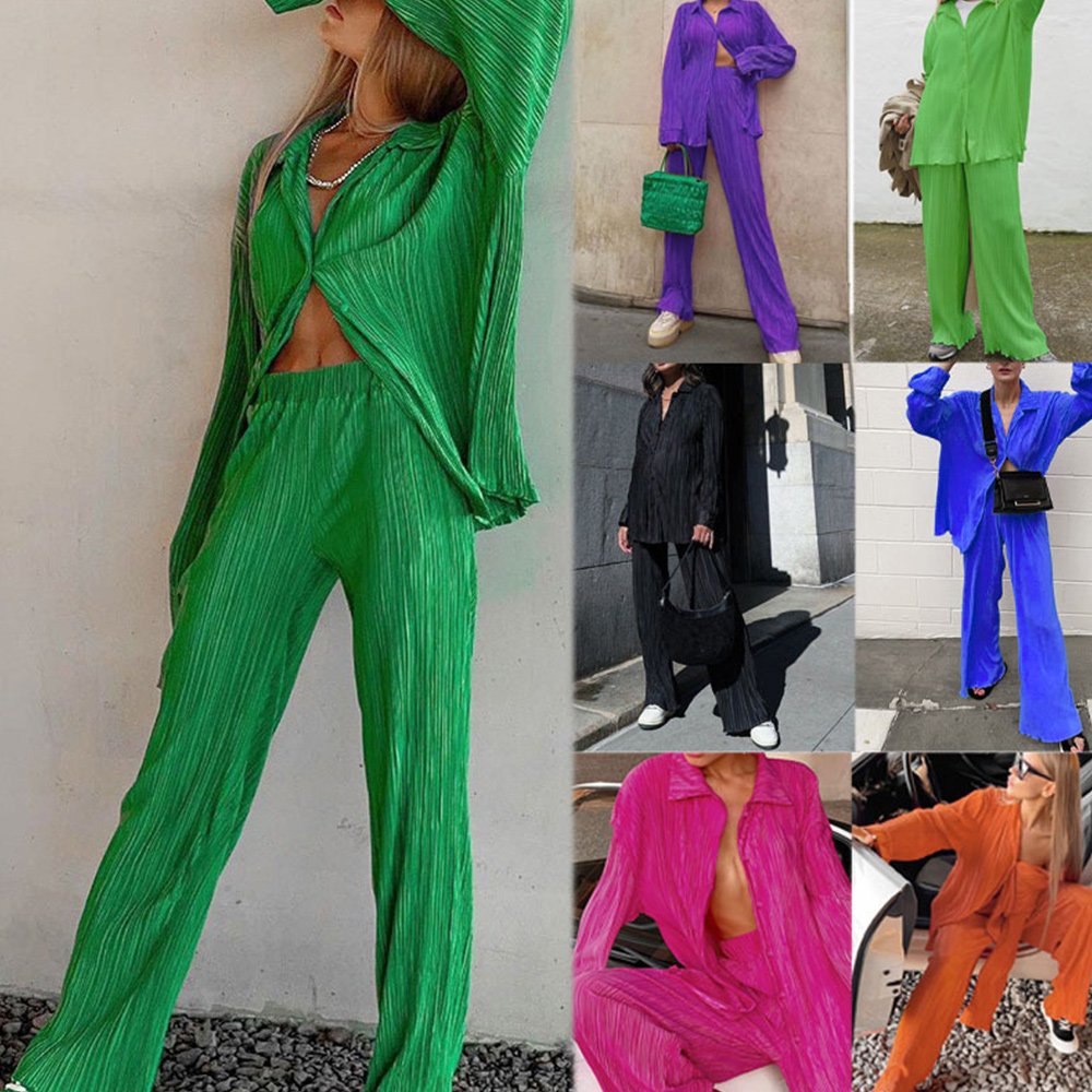 Women Clothing Retro Casual Fashion Fashion Suit 2022 Long Sleeve Loose-Fitting Pleated Wide Leg Pants Two-Piece Set