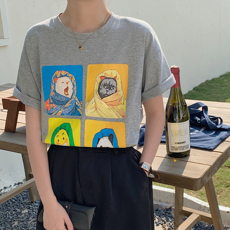 Loose Fashionable Niche Cartoon Cat Print Women’s T-Shirt