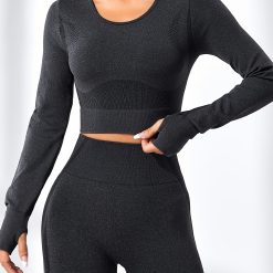 2pcs Women’s Yoga Workout Set – Long Sleeve Crop Top with Thumb Holes and High Waist Running Leggings – Comfortable and Stylish Activewear for Exercise and Fitness