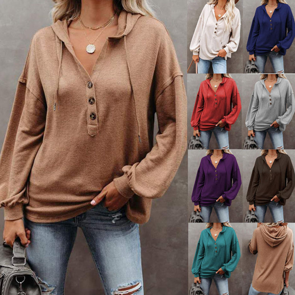 Women’s Solid Color V-Neck Button Hooded Loose Long Sleeve Sweatshirt
