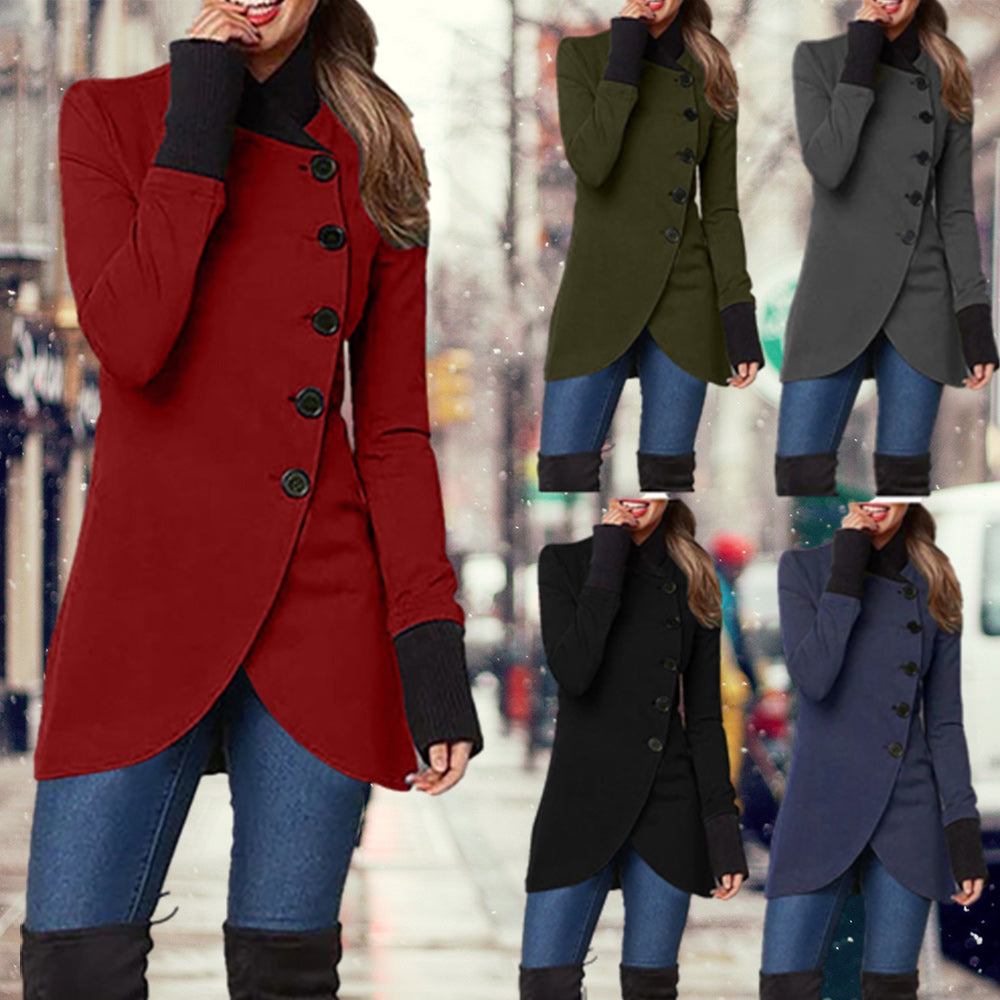 Women’s Solid Color Elegant Diagonal Placket Single Breasted Mid Length Coat